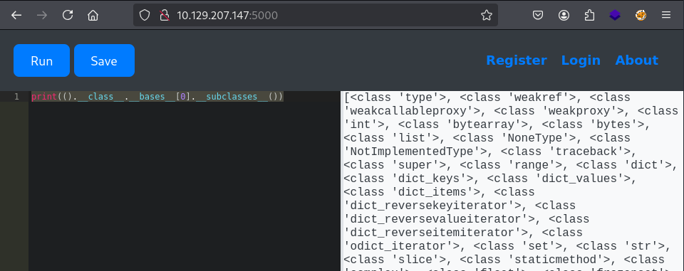print(().__class__.__bases__[0].__subclasses__())
