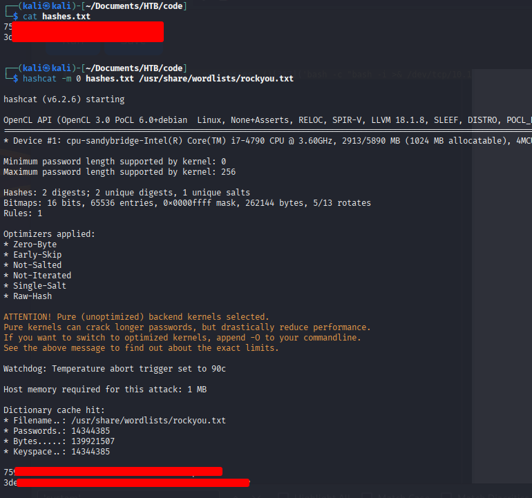 hashcat -m 0 hashes.txt /usr/share/wordlists/rockyou.txt