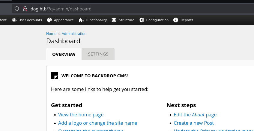 Dog machine on HachTheBox is an easy-level machine. For the initial foothold, after first scanning the application it revelas it consists of a CMS with a repository accessible. Under that repository we can gather some information that gives us access as admin on the CMS. After that we can leverage CMS module upload to gain a reverse shell. From there privilege escalation is obtained after pivoting to a user which was reusing a password and was able to execute binary as sudo which had a command that allowed to run arbitrary PHP code and escalate to root.