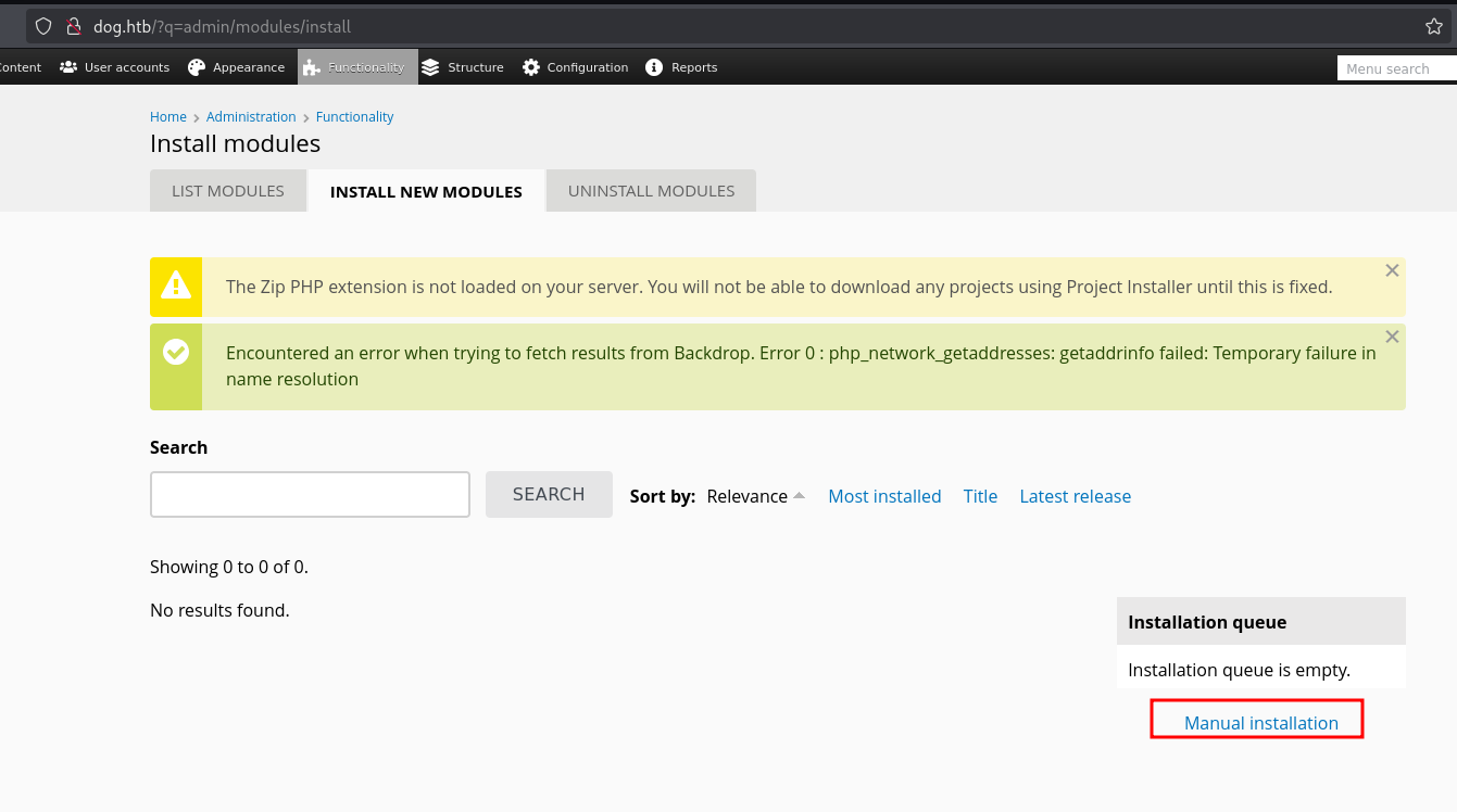 The url reported by the exploit is not working fine. So place after some search we found that URL to upload modules is the following one http://dog.htb/?q=admin/modules/install