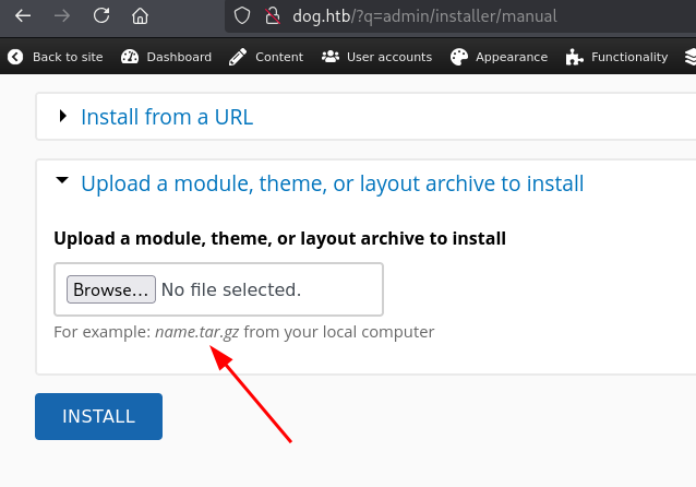 Go to http://dog.htb//admin/modules/install and upload the shell.zip for Manual Installation.